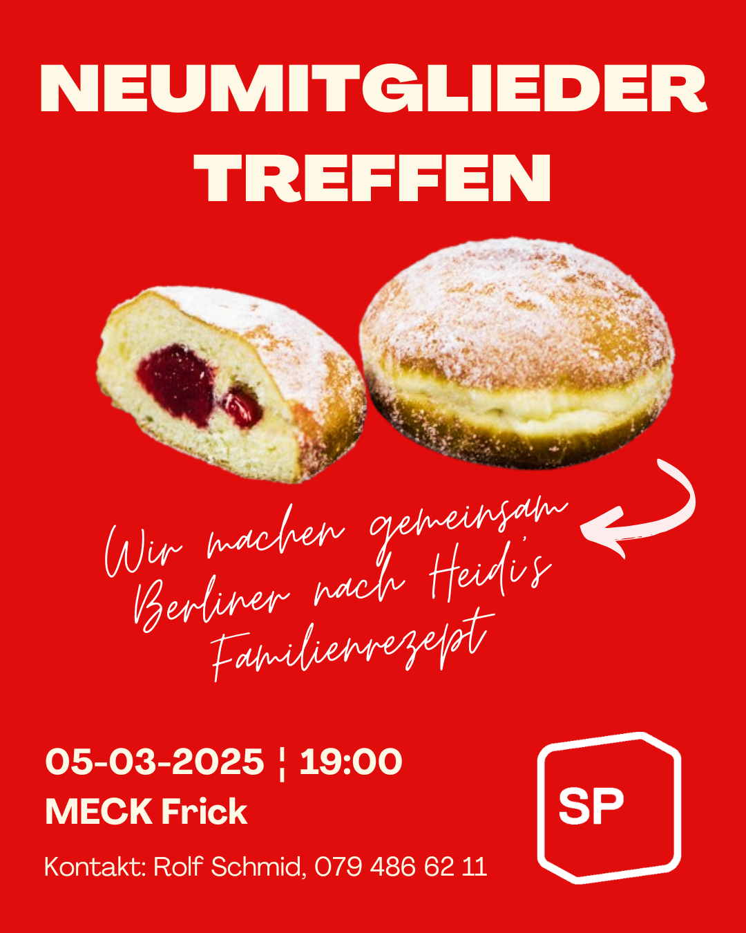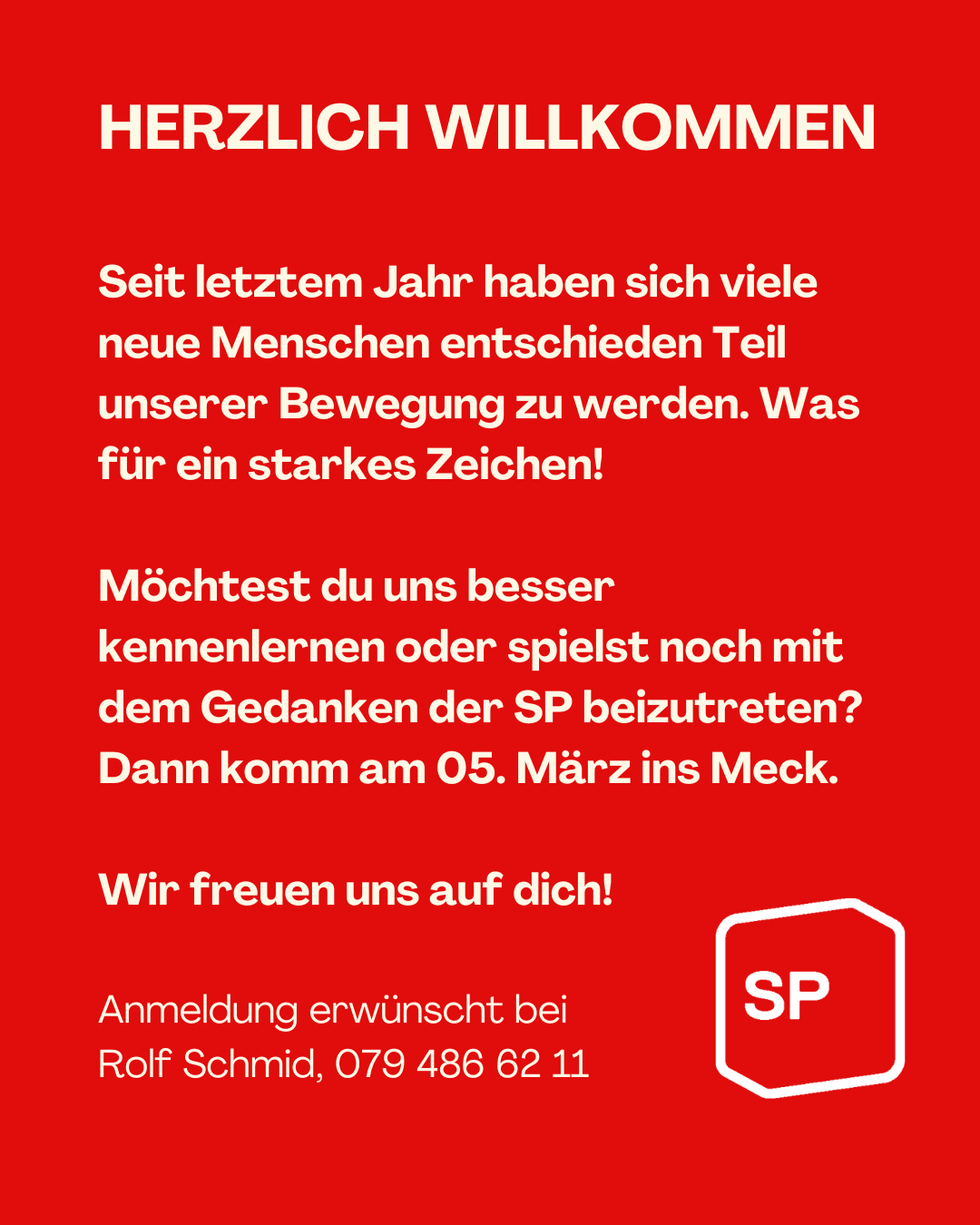 Möchtest du uns besser kennenlernen oder spielst noch mit dem Gedanken der SP beizutreten? Dann komm am 05. März um 19 Uhr ins MECK Frick.