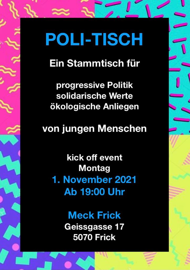 Der „Poli-Tisch“ ist ein Stammtisch für progressive Politik von und für junge Menschen mit solidarischen Werten und ökologischen Anliegen aus dem Fricktal (Bezirke Rheinfelden und Laufenburg), aber auch der angrenzenden Umgebung.